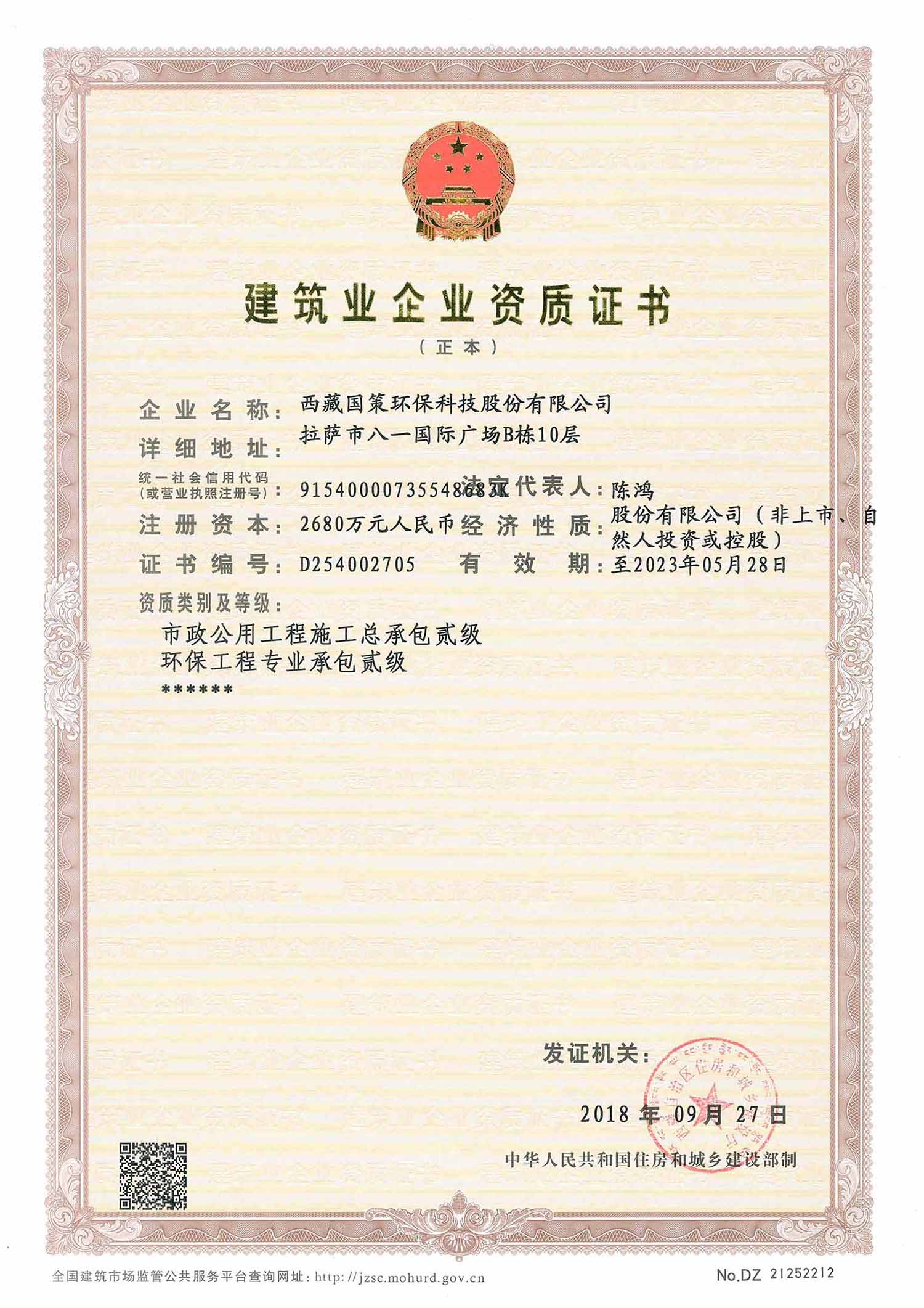 國策環(huán)保擁有住房和城鄉(xiāng)建設(shè)部頒發(fā)的建筑業(yè)企業(yè)市政公用工程施工總承包貳級資質(zhì)、環(huán)保工程專業(yè)承包貳級資質(zhì),同時擁有環(huán)保、市政、機電等各類專業(yè)工程技術(shù)人員共計40余人,并先后承擔(dān)了眾多污水廠、垃圾填埋場、自來水廠、醫(yī)療廢物處置中心等項目的施工任務(wù)。