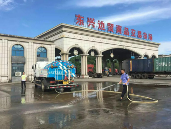 ▲對國門口岸旅游熱點(diǎn)景點(diǎn)進(jìn)行沖洗作業(yè)
