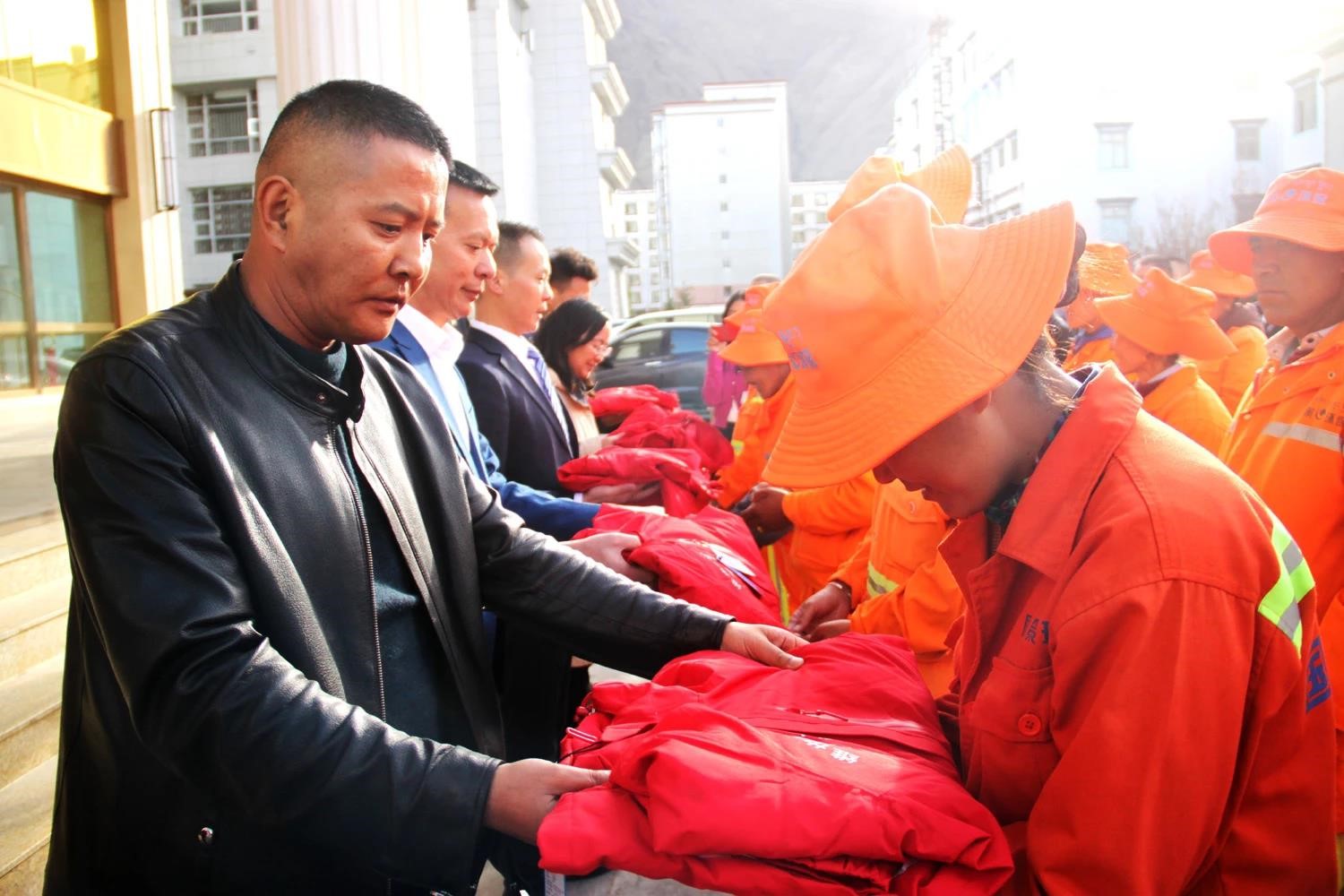 乃東區(qū)副區(qū)長格桑羅布、乃東區(qū)住房和城鄉(xiāng)建設(shè)局局長張俊、國策公司負(fù)責(zé)人次仁旺慶應(yīng)邀參加活動(dòng),并共同為環(huán)衛(wèi)工人發(fā)放了保暖御寒的嶄新環(huán)衛(wèi)工裝。