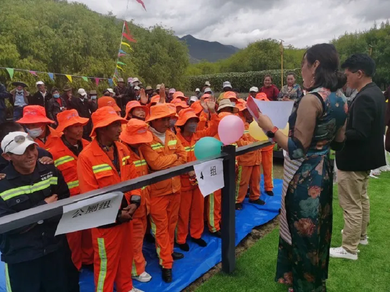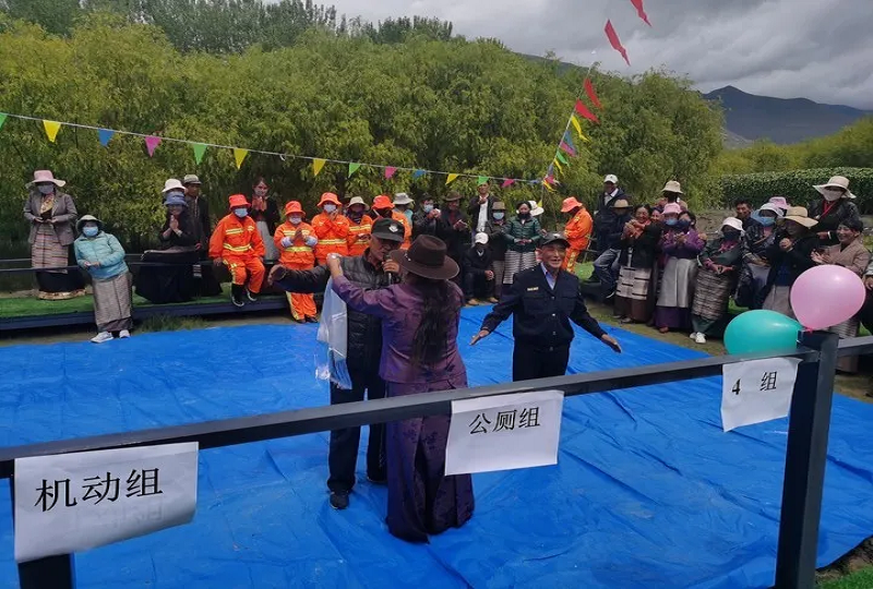 熱情洋溢的歌舞、考驗團結(jié)的拔河比賽、充滿濃烈民族色彩的抱石頭、翻桶比賽......平時樸素的環(huán)衛(wèi)工作者們紛紛脫下了沉悶的工作服,穿上了華美的藏袍,伴隨著精彩的活動,大家或是跳舞唱歌,嘻嘻鬧鬧;或是三五成群,談笑風生,整場活動高潮迭起、笑聲不斷。