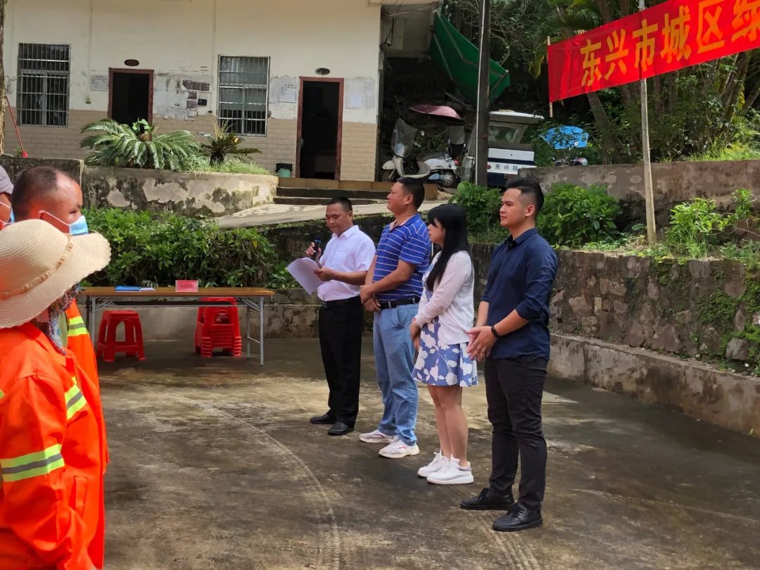 圖從左至右分別為:東興市園林處主任黃俊曄、東興市城市管理監(jiān)督局副局長(zhǎng)尚顯華、東興市城市管理監(jiān)督局副局長(zhǎng)黃曉璇、東興國(guó)策環(huán)??偨?jīng)理劉桂文