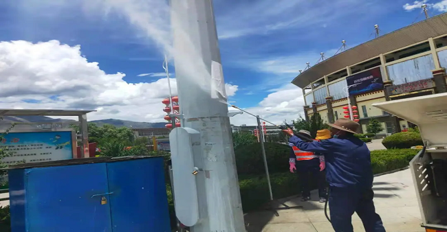 同時,山南分公司還調(diào)配了15名員工、1輛高壓沖洗車、1輛灑水車、1輛洗掃車、1輛多功能沖洗車組成了體育場臨時清洗隊,對體育場垃圾桶、電樁小廣告、周邊雜草以及地面等進(jìn)行了集中清理,通過采取高壓水槍沖洗和人工擦拭相結(jié)合的方式,體育場周圍環(huán)境及設(shè)施煥然一新,顯露“本色”。
